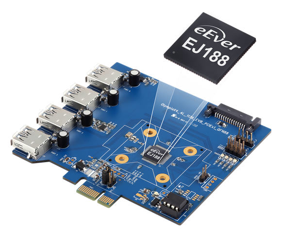 The EJ188 has a PCIe Gen2 x1 lanes for the PC host system and four USB3.0 downstream ports, which provide SuperSpeed, HighSpeed, FullSpeed and LowSpeed signals for USB 3.0 compliant peripherals and existing USB 2.0/1.1 peripheral devices.